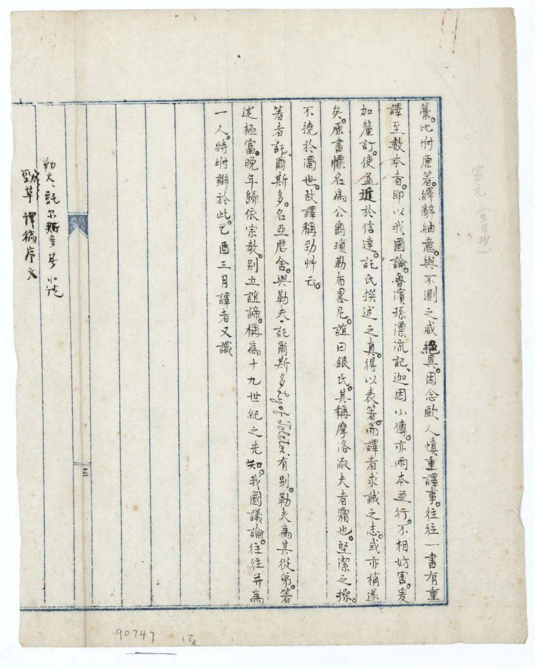 1.《〈劲草〉译稿序文》:《劲草》是俄国阿·康·托尔斯泰所著历史小说,现译《谢历勃里亚尼公爵》。约1907年冬,周作人从英译本转译,由鲁迅修改誊正,该译稿遗失未印行,仅存鲁迅以“译者”身份代作的序言残稿1叶(见插图),落款时间为己酉三月,即1909年4月至5月。稿纸中缝标“五”,应是文章叶序。手稿上还有周作人手书说明此为《劲草》译稿之序。使用十二行蓝栏稿纸,这种稿纸在现存鲁迅手稿中比较少见。本手稿是国图藏写作时间最早的鲁迅创作手稿。