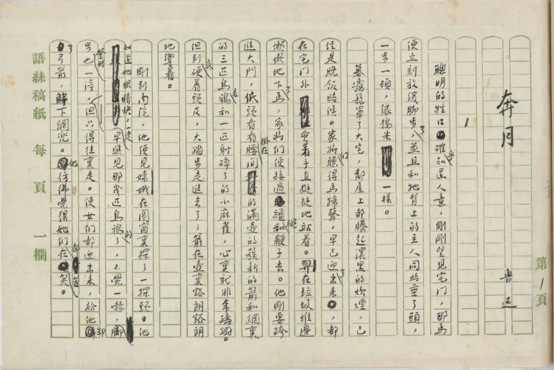3.《奔月》:完成于1926年12月30日,初刊于1927年1月25日《莽原》半月刊第2卷第2期,收入小说集《故事新编》。手稿共16叶,使用绿格“语丝稿纸”,与其他5种鲁迅手稿合订为一册。本文手稿修改颇多,墨迹有浓淡之分,能够反应作者早期创作时大幅修改,初稿、修改稿与定稿合一的创作习惯。本文手稿(见插图)是国图藏鲁迅手稿中唯一一种小说手稿。《奔月》另有一种用于出版《故事新编》的手稿,藏于上海鲁迅纪念馆,以《莽原》的发表版本为底本,有少量修改,最重要的一处修改是将落款时间从1926年12月30日改为1926年12月。