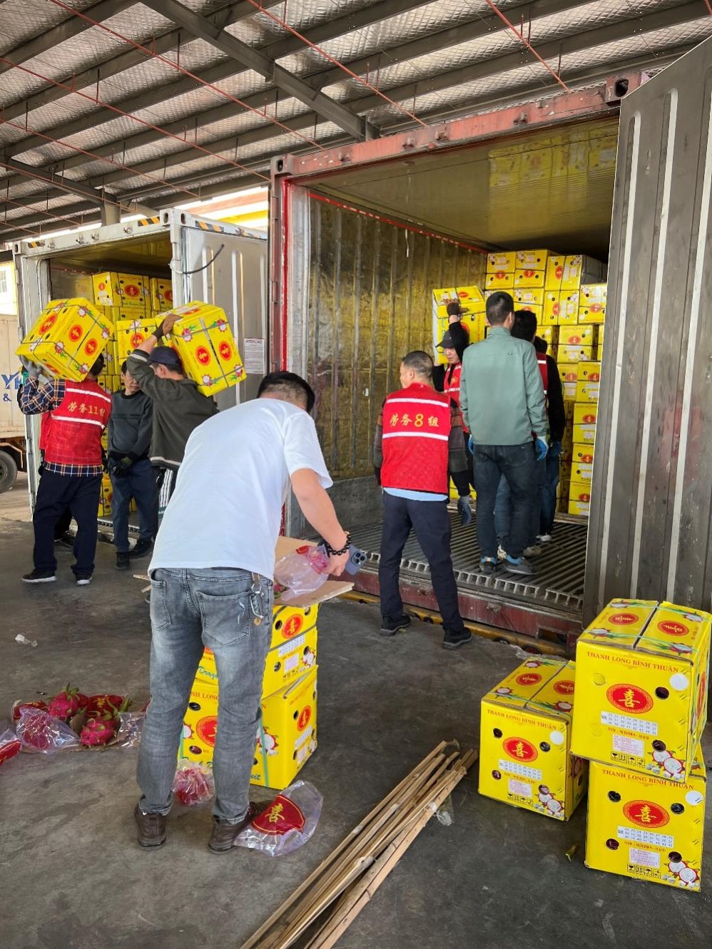 边民装卸队正在将从越南运来的水果装卸到国内的卡车上