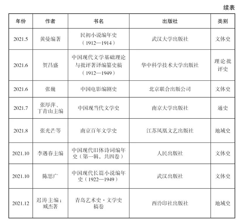 近十年来出现了至少两种值得注意的新的文学史类型,即语言史与制度史。其中前者包括刘恪的《中国现代小说语言史(1902—2012)》(百花文艺出版社2013年出版)、张卫中的《20世纪中国文学语言变迁史》(中国社会科学出版社2013年出版)、朱晓进等的《作为语言艺术的中国现代文学发展史:文学语言变迁与中国现代文学形式的演进》(人民出版社2015年出版)三种;至于后者,虽然明确以“制度史”命名的只有丁帆主编的《中国现当代文学制度史》(作家出版社2020年出版)一部著作,但是此前出版的吴效刚著《民国时期查禁文学史论》(中国社会科学出版社2013年出版),所关注的“查禁文学”也是文学制度的一个侧面,因此也应该归入这一类别。另外在更早的二十一世纪之初,王本朝的《中国现代文学制度研究》(西南师范大学出版社2002年出版)也是文学制度研究方面的重要成果,尽管它不是一本文学史著作,但至少可以说明近年来文学制度在文学史研究领域所受到的关注程度。
