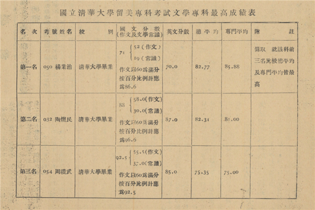 国立清华大学留美专科考试政治专科最高成绩表