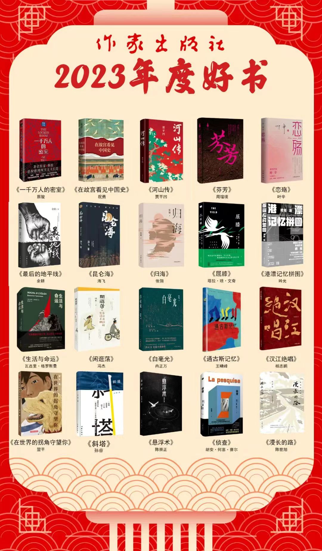 经评委会热烈讨论与商议,最终评选出作家出版社2023年度好书20部,分别为:蔡骏《一千万人的密室》、杨志鹏《汉江绝唱》、翌平《在世界的拐角守望你》、孙睿《斜塔》、陈崇正《悬浮术》、余耕《最后的地平线》、塔拉·琼·文奇《屈膝》、陈世旭《漫长的路》、叶辛《恋殇》、祝勇《在故宫看见中国史》、冉正万《白毫光》、吟光《港漂记忆拼图》、海飞《昆仑海》、 王啸峰《通古斯记忆》、周瑄璞《芬芳》、张翎《归海》、瓦西里·格罗斯曼《生活与命运》、 贾平凹《河山传》、冯杰《闲逛荡》、胡安·何塞·赛尔《侦查》。