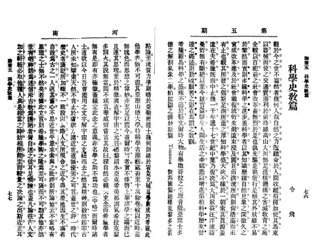 《科学史教篇》初发表于一九○八年六月《河南》月刊第五号,署名令飞。