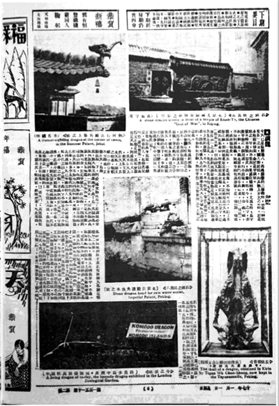 “新年号”一期两张八个版面,第一张三个版面遍布“龙卡”(第四版为广告),第二张四个版面里,还点缀着另外三张“龙卡”。其中,“热河行宫殿角檐上之龙(亦名螭吻)”与“北京宫殿坛角泄水之龙”两张图片,但凡去参观游览过这些皇家宫殿的读者,应当也不陌生。不过,还有一张图注为“石刻之龙其五:北京某处关帝庙前之影壁(甚属罕见)”的图片,恐怕会颇令时人惊异一下,尤其是图注中那“甚属罕见”四个字,更容易令人产生一探究竟之意。