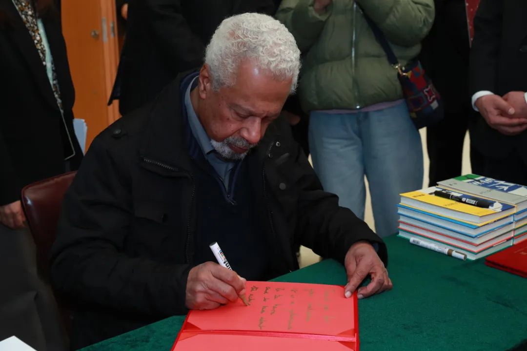 古尔纳向中国现代文学馆捐赠了十部作品的中译本,并在作家书房门口签名留言