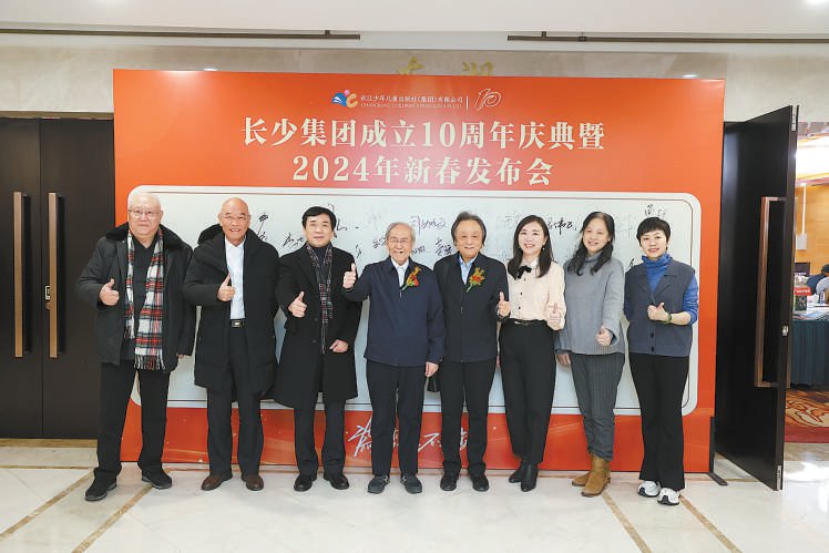 在长江少年儿童出版社(集团)有限公司成立10周年庆典暨2024年新春发布会上的合影。从左至右依次为高洪波、海飞、曹文轩、束沛德、王泉根、葛竞、陈晖、崔昕平。