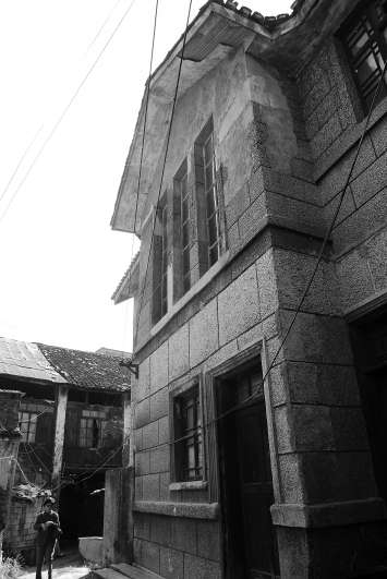 跟随戴明新走到小道之东的房屋,一派西式的装饰风格呈现在眼前,粉墙、吊顶、壁柜、地板等,历经多年而样式仍不失先锋。最为宜人的是,一色朝东的楼房都在屋前配备一个院落,石桌、石凳,莳花杂木,月洞门,大小花台,全都分配得当。