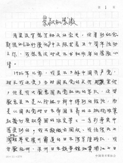 岁月荏苒,这篇由我保存了近40年的华君武“崇敬和感谢”征文稿,我准备在适当的时候捐赠给有关博物馆、纪念馆,让千千万万的年轻人和参观者从这一篇征文中,了解到埃德加·斯诺《西行漫记》一书的魅力,并从漫画大家华君武与此书结缘的故事中,了解到近百年前那个烽火连天、洪流滚滚、英勇辉煌的岁月。