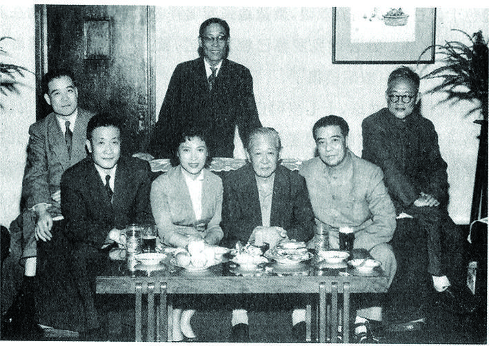 1962年,(坐者从左往右)罗荪、刘白羽、秦怡、中岛健藏(日本友人)、阳翰笙、巴金合影