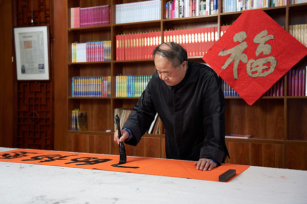 走进北京西郊的两块砖书房,莫言正站在一张长长的书桌旁挥毫:“一江春水向东流”。写到“东”字时,他轻声嘀咕了一句:“有没有河水向西流呢?”