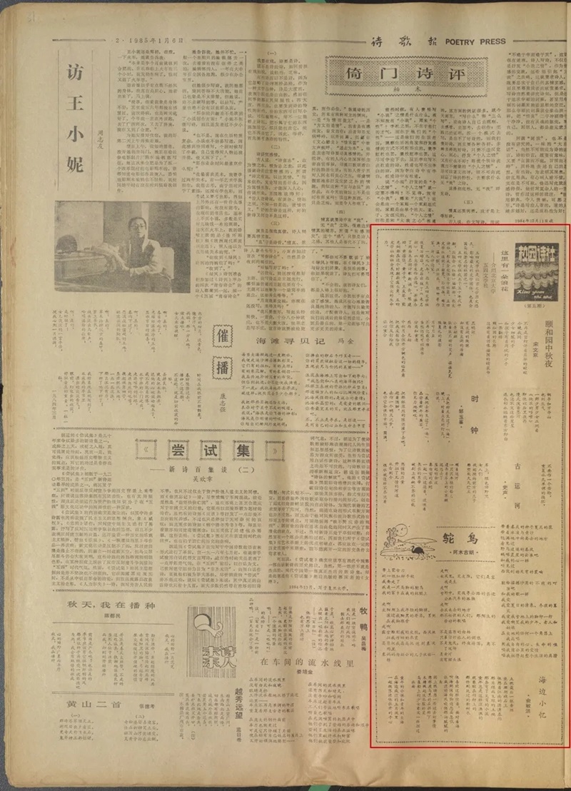 编者按:《诗歌月刊》编辑整理创刊40周年资料时,在1985年1月6日的《诗歌报》(刊物前身)上,看到署名“俞敏洪”的一首诗作《海边小忆》,不禁疑惑地问:这位是否就是新东方的俞老师呢?仔细一研读,发现这一期“校园诗社”栏目介绍的正是北京大学五四文学社。时间也能对得上。确定是俞敏洪没错了!