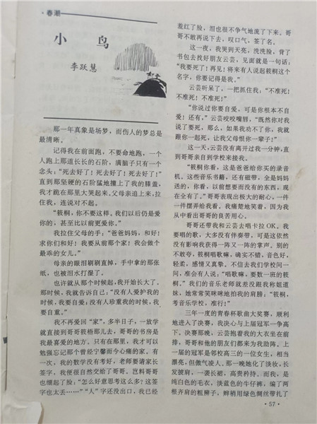 李跃慧的第一篇小说发表在《金沙江文艺》上,那时候她读高一,喜欢听歌,同学之间互赠的礼物常常是手抄歌词,有耐心的连歌谱都抄上。她听了赵传唱的《我是一只小小鸟》,高亢嘹亮的歌声传递出小小生命的无奈与倔强,深受感染,以此为题写了一个小女孩的成长故事。稿子是语文老师帮她投的,小说发表后,语文老师把她和她的朋友叫到办公室,一句一句给她们念编辑老师写来的信。