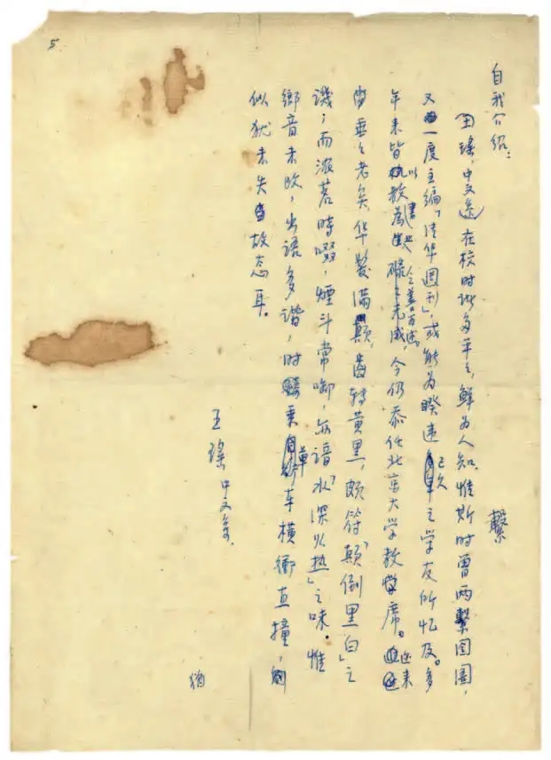 为王瑶先生立传,既容易又艰难——说容易是因其生平基本局限于校园,没有什么不能言说的重大秘密;说艰难是材料单一,主要是著述文字,不太适合在画传中大量引述。王先生自述生平的文章很少,除 了各书序跋略为涉及,再就是《坷坎略记》(1942)、《守制杂记》(1947)、 《自传》(1979)、《治学经验谈》(1983)、《自我介绍》(1987)等那几篇短文,还有历次政治运动中的自我检讨,作为一种特殊文献,也可纳入阅读与辨析视野。