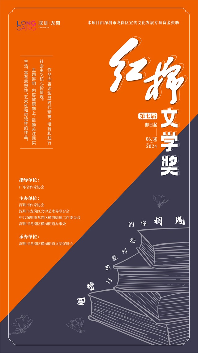 第七届“红棉文学奖”是深圳市龙岗区宣传文化发展专项资金资助项目,由广东省作家协会指导,深圳市作家协会、龙岗区文学艺术界联合会、中共深圳市龙岗区横岗街道工作委员会、深圳市龙岗区横岗街道办事处联合主办,真诚欢迎所有汉语写作者踊跃投稿。