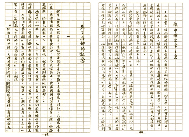 鲁迅杂文《为了忘却的纪念》《祝中俄文字之交》手稿,收录于《南腔北调集》