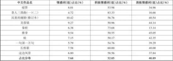 经统计,10个语料库中的积极情感词(组)占比52.05%,消极情感词(组)占比40.89%。研究显示,10部作品的评论中积极情感词(组)占比均高于消极情感词(组),这说明目前超过半数俄罗斯读者对茅奖获奖作品的俄译本持积极态度,整体接受度较高。各作品的积极情感词(组)和消极情感词(组)占比详见表2。