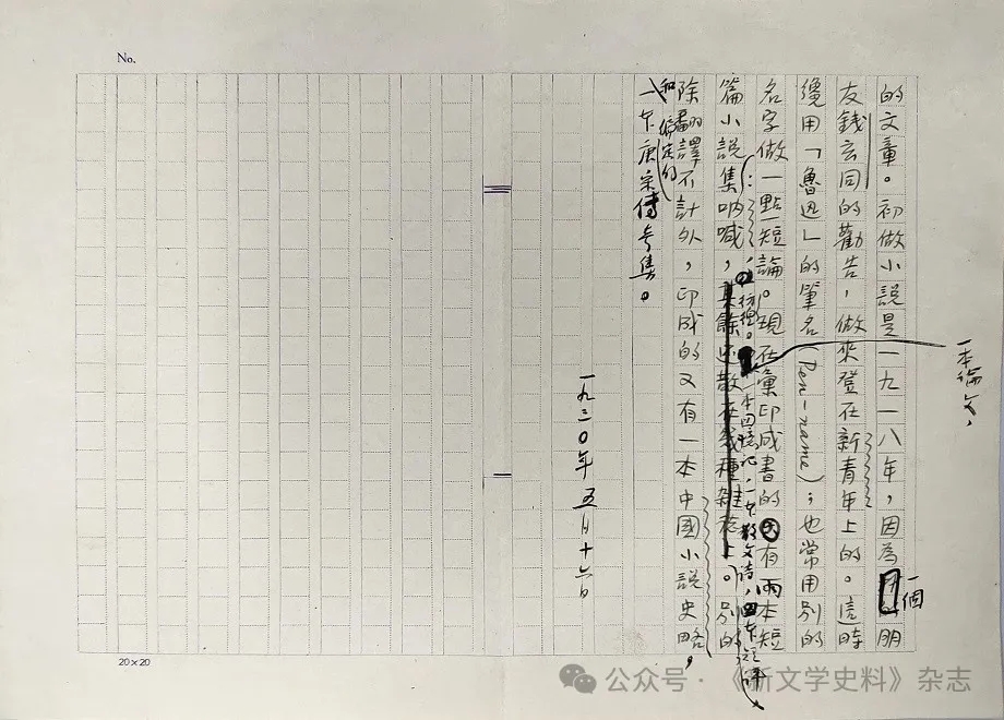 不同于用于再编的、经过修改誊写的《南腔北调集·〈自选集〉自序》手稿,“鲁迅手稿补遗一页”是用于初次刊印的,写作时间应即《南腔北调集·〈自选集〉自序》文末所记“一九三二年十二月十四日”。笔者翻查了此日前、后数年的鲁迅文稿,检出由柔石录写、鲁迅题名并作改的《鲁迅自传》手稿⑥,所用稿纸和“鲁迅手稿补遗一页”相似度较高,页面布局、纹路细节基本一致。此种《鲁迅自传》稿共三页,一列二十格,共二十列,格线淡紫色;稿纸高19.4cm,宽27cm,页眉左端印“NO.”,页脚左端印“20×20”。此稿第三页只占用了右半页,左半为空白稿纸,为便于比较观览,录末页图版于此,见上图。