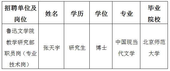 因鲁迅文学院教学研究部职员岗拟聘人员武茳虹自愿放弃聘用资格,根据公开招聘工作有关规定,递补张天宇为该岗位拟聘人员,现予以公示。公示期间,如有问题,请直接向我单位反映,或通过中央和国家机关所属事业单位公开招聘服务平台反映。