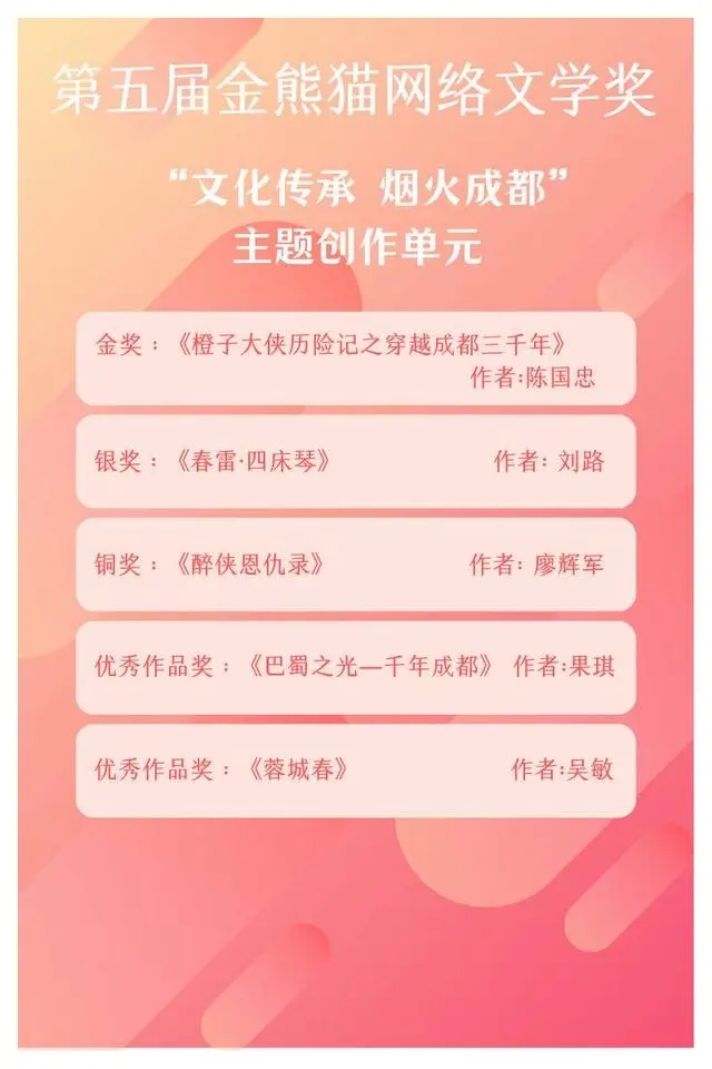 现场揭晓了第五届“金熊猫”网络文学奖获奖作品名单。本届“金熊猫”网络文学奖共征集322部作品,涵盖古典仙侠、现实百态、传统武侠、时空穿越等题材,最终角逐出17部获奖作品。其中,《我为中华修古籍》获第五届“金熊猫”网络文学奖长篇单元金奖,《水安息》获中短篇单元金奖,《橙子大侠历险记之穿越成都三千年》获“文化传承 烟火成都”主题创作单元金奖。此外,《电竞竞猜这十年》《时光织锦店》《春棠欲醉》等作品分获最具时代精神奖、最具创意价值奖和最具潜力IP奖等奖项。