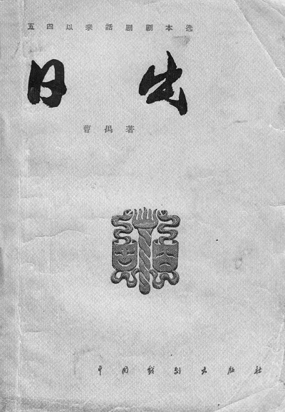 中国戏剧出版社的单行本《日出》,1957年9月第1版第1次印刷,印数为0001—9000册;1958年2月第1版第2印,印数为9001—14000册;1959年4月第1版第3印,印数为14001—17500册。这三次印刷,封面设计一致。底色为浅黄色细网纹,书名写作黑色,位于封面左上方,书名下有中国戏剧出版社的社标,书名上方有“五四以来话剧剧本选”字样。至第1版第4印,印数为17501—27500册。这一印封面设计大不相同,取消了原封面上“五四以来话剧剧本选”字样和社标,同时底色改为浅绿色,书名作深绿色,靠近书脊处留有两指宽的白边,边框为简化祥云纹,白边上部并排印两朵红色小花。