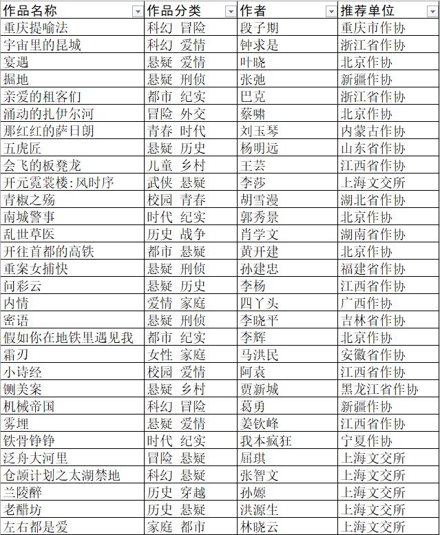 文学是影视的源头活水,在影视改编和创作中发挥着重要的母本作用。此次推介会共推荐《欢迎来到人间》《河山传》《登春台》《北爱》《花灯调》等电竞竞猜“新时代山乡巨变创作计划”和“新时代文学攀登计划”入选作品18部,以及《宇宙里的昆城》《重庆提喻法》《宴遇》《掘地》《亲爱的租客们》等文学转化影视重点推荐作品30部。活动现场,邱华栋、李晓东、马文运、柳建伟、周建东、宁江生、余飞等共同启动文学转化影视重点推荐作品发布仪式。据介绍,推荐作品涵盖历史、悬疑、武侠、科幻、都市、乡土、爱情、纪实等多个题材领域,情感真挚、思想深刻、艺术表现力强,具有很高的艺术价值和社会意义。