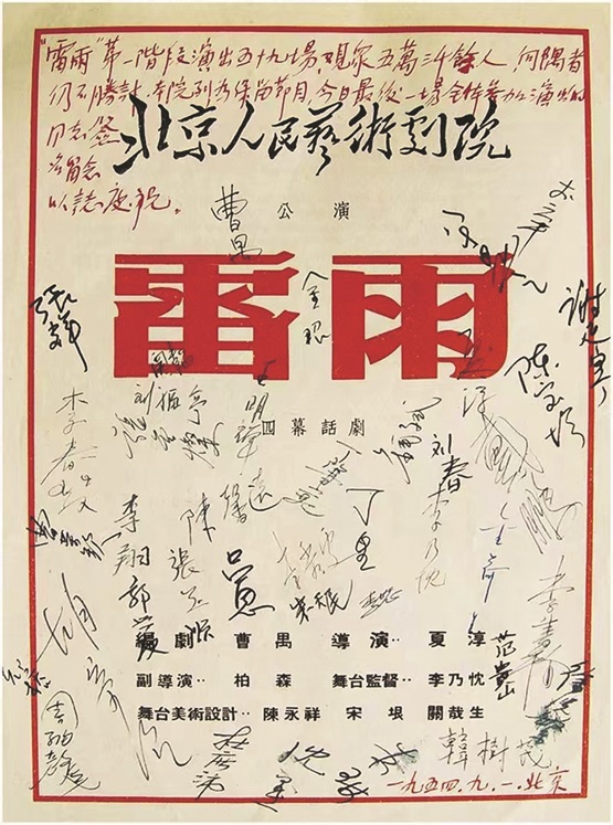 一九五四年,北京人艺演出《雷雨》第一阶段演出59场,观众达53000余人。在最后一场的演出结束后,曹禺和全体演职人员签名留念