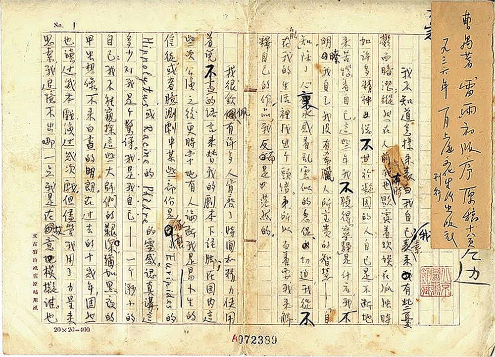 《雷雨·序》手稿