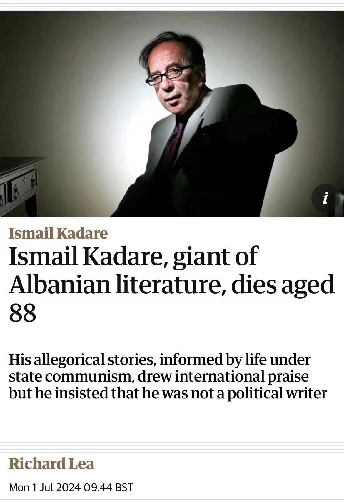 当地时间7月1日,阿尔巴尼亚当代最著名的作家和诗人、首届布克国际文学奖得主、诺奖热门候选人伊斯玛依尔·卡达莱逝世,享年88岁。