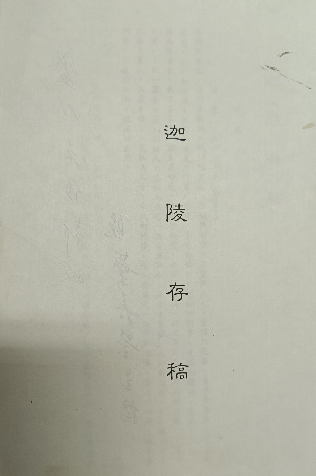 先生的大名我是早已听说,但可惜没有见过面。至今想起,仍为憾事。我赶忙打开档案,翻阅这份存有先生手迹的珍贵资料。这是一份打印稿,第一页竖排印着书稿名称“迦陵存稿”。其背面写有两行字“盛成老伯郢政 晚叶嘉莹呈稿”。“郢政”两字我很少见到,大致能猜到它的意思。为准确把握这个词,我特意查询了一下,有关它的介绍大致如下:郢政意为郢正,斧正。明朝黄中在其 《重刻朱子年谱记》一文中,有这样的表述:"且身处孤陋,书籍不全,暂作裨谌之补,祈请诸君更为郢政。" 清朝魏际瑞在《与子弟论文》中是这样的:"人以文字就质于人,称曰'正之'。忽念政者,正也。改称曰'政'。又念正者必须删削,乃曰'削政'。又念斧斤所以削也,转曰'斧政'。又念善斧斤者莫如郢人,易曰'郢政'。"也许是这个词有些偏僻,后来人使用的不是很多。这份打印稿竖排打印,右侧装订,共27页。书稿收录了43篇诗词,创作时间跨度长达42年,创作时间最早的是1941年先生17岁时写的五言诗《咏怀》,“高树战西风,秋雨檐前滴。蟋蟀明空庭,夜阑犹唧唧。……夜夜梦江南,魂迷关塞黑。”创作最晚的是1983年创作的《蝶恋花》和《木兰花慢·咏荷》。创作地点更是跨越半个地球,由北京到南京,由台南到哈佛,由温哥华到巴黎,由科隆到罗马,由泰山到曲阜。先生在行万里路时,手中的笔从未停歇,她一直在书写自己心中的千言字。这些诗篇有写景的,有咏物的,有感怀的,有送别的,先生用它们记录着自己的人生足迹与世事沧桑。