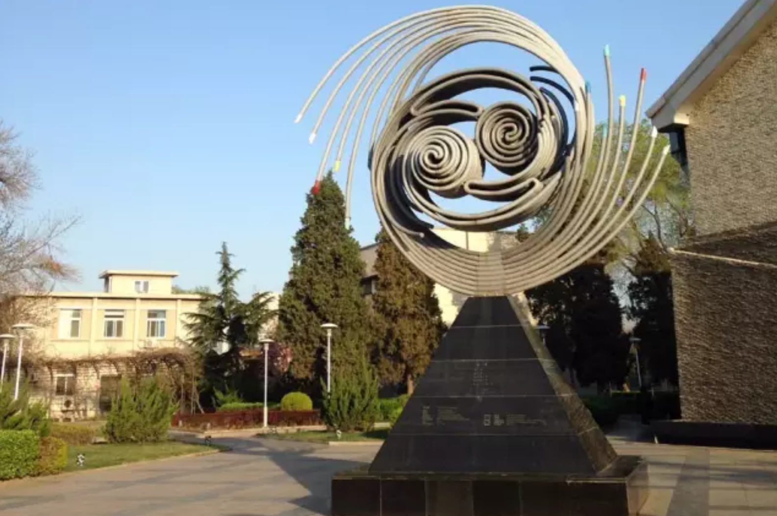 丙申春天来得很早,北京的樱桃花刚到四月就开了,小小的蓓蕾在一夜春雨之间,缀满了树枝,去往西郊中科院高能物理研究所的路上便能隐约闻到花儿的芬芳。在芳香的气息里,我走进那座全国一流物理学家汇集的大院,迎面见到一座奇异的雕塑。