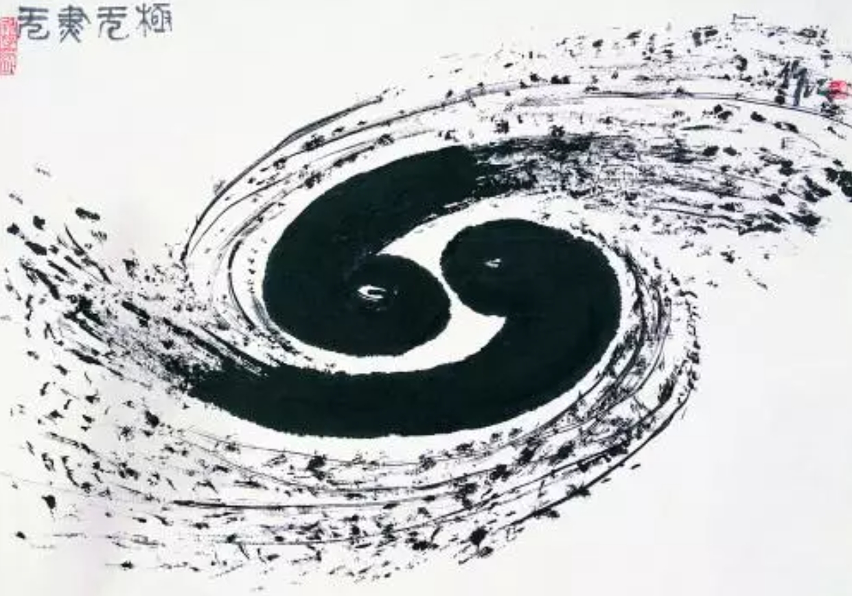 1988年在举办《二维强关联电子系统》国际学术研讨会时,李政道请来了吴作人先生,大师心领神会,运用中国古代哲学的观念,认为所有的复杂性都是从简单性产生的,正如李政道先生特别喜爱的老子《道德经》中所言“道生一,一生二,二生三,三生万物。”但是,如何从简单到复杂的呢?通过科学实验人们得知,正负电的粒子之间的相互作用,形成了原子分子以至世界万物。正负两极的对偶结构,在中国古代哲学里称之为“阴阳”,太极符号表现的就是阴阳之间的关系。吴作人就此画了一幅变形太极图《无尽无极》,他挥洒笔墨,心连天宇,两道反向交织又指向无边境界的力与光,浩浩淼淼,飘然而又无所不及。