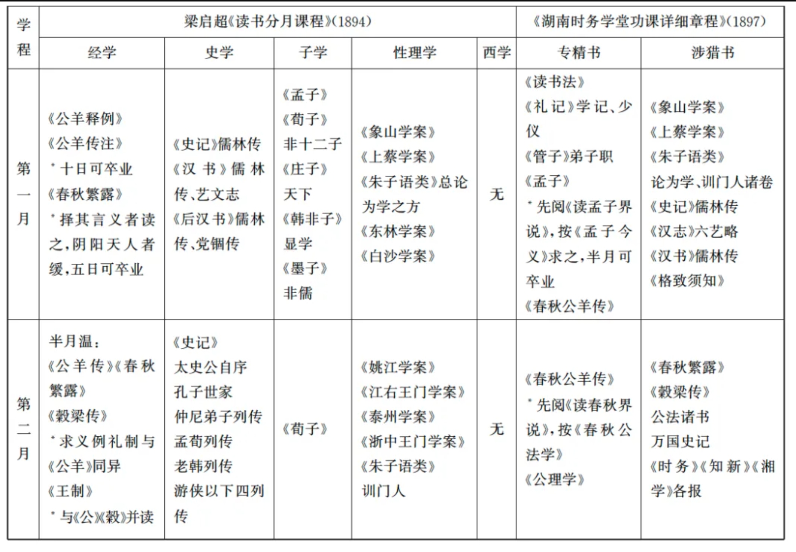 读书功程的压缩,伴随着读书次第和读法的更新。程氏《读书分年日程》与梁氏《读书分月课程》相隔五百七十年,形貌相似而性质迥别。前者笼括士子读书应举全程:从八岁前的启蒙识字,八至十五岁的读经,十五岁起三四年读四书集注、本经传注、性理诸书,直至读看《通鉴》、韩文、《楚辞》,专力学文而应举,实是一整套的士大夫教养规划。相比之下,康梁“课程”针对已有知识基础的一般读书人,作为一条快速融入“康学”的路径,更强调“律例”“门径”“源流”等具体学问知识以外的结构性要素。梁氏《读书分月课程》首重《公羊传》《春秋繁露》《穀梁传》《礼记·王制》等晚近今文经学确立的经典,要求先通其“例”。如经学须先读刘逢禄《公羊释例》,然后才是《公羊传》及何休《注》。这在《汉书·艺文志》“六艺略”以来经书本文居首、传注依次而下的传统经目秩序下,几乎是不可想象之事。紧接几部今文学经典的,则是康氏《新学伪经考》、刘逢禄《左氏春秋考证》、邵懿辰《礼经通论》、魏源《诗古微》等近代经说。继之以《五经异义》与《白虎通》,至第五、六月方接读《礼记》《大戴礼记》;《易》《诗》《书》诸经则因“今文传注率经阙失”而全未涉及。时人指出这种读经新法的荒唐之处,在于“原经尚未寓目,遽以臧否之言先入其胸中”。实则这正是“数日可了”得以实现的要诀。与此相应,梁氏《读书分月课程》的史学部分,亦以《史记·儒林列传》《汉书·儒林传》《汉书·艺文志》《后汉书·儒林传》《后汉书·党锢传》打头,强调“经学源流”;子学部分除晚清今文家普遍重视的《孟子》(已不再视为经书)外,则为《荀子·非十二子》《庄子·天下》《韩非子·显学》《墨子·非儒》诸篇,梁氏日后大治“学术史”的取向,在此已初见端倪。