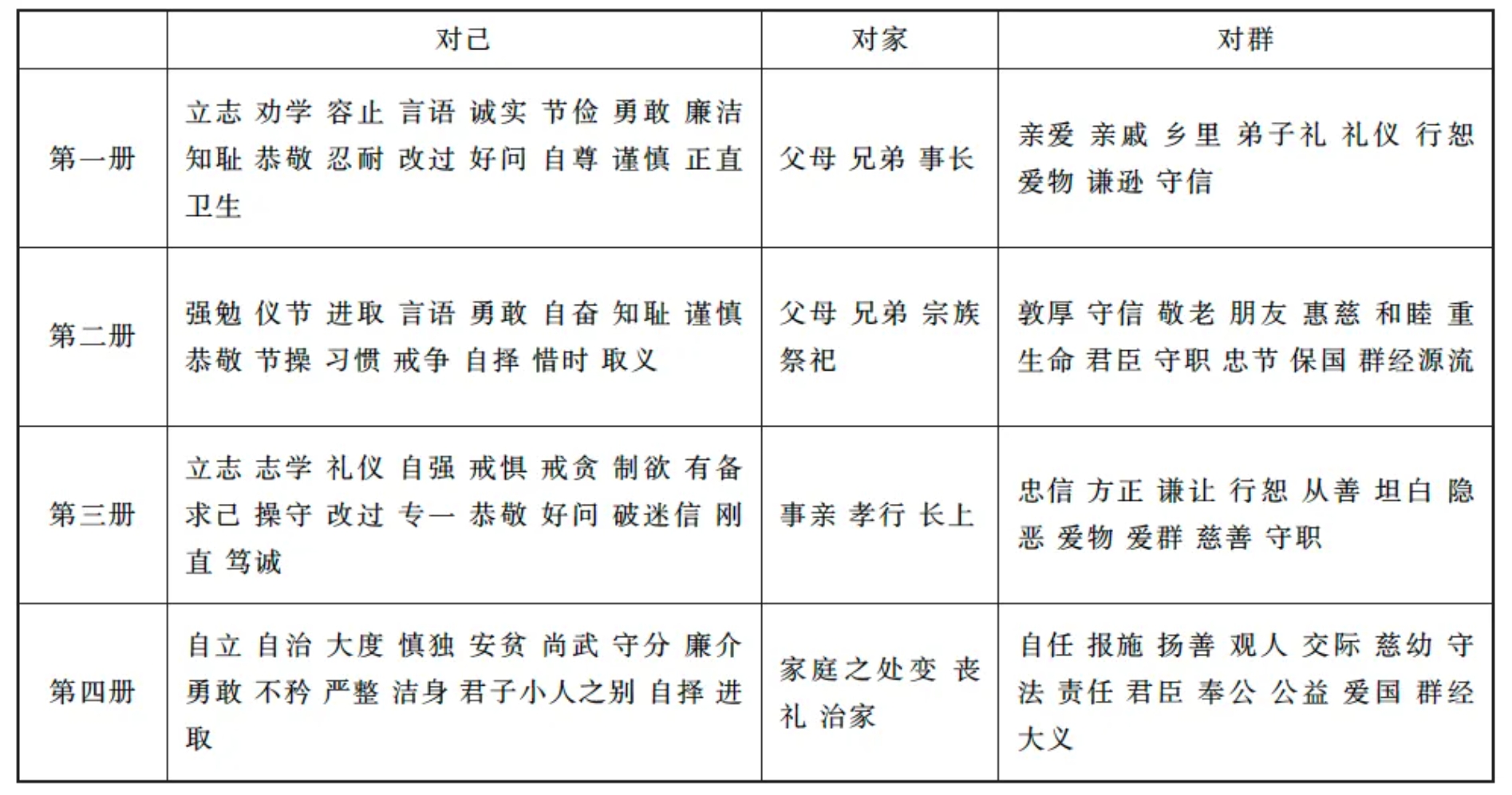 真正凭借近代学科框架消解经目秩序和经文语境,且较有影响的经学教科书,当数光绪三十三年九月商务印书馆初版《高等小学堂用经训教科书》(以下简称《经训教科书》)。该书由林万里、黄展云、王永炘三人合编,共四册,配合高等小学四学年。卷首《编辑大意》声称其书遵循光绪三十二年十一月十七日(1907年1月1日)谕旨“发明经传有益身心之言汇为一编”的要求,“略仿朱子《小学》体例,采取古人嘉言懿行以为学生模范;唯所引用者,概以群经为断,故定名为经训教科书”。这套教科书曾一度被设定为读经科用书,却并不遵循癸卯学制按经目次序逐一讲读的要求。《编辑大意》又云:“本书各册均按对己、对家、对群三大纲,分为三编,而将各课德目依类编次。”“对己”“对家”“对群”的“新三纲”取代了君臣、父子、夫妇的旧三纲,成为整套教科书的骨架。在三者之下,再区分若干“德目”为各课,取自各经的经文片段被安排在这些德目之中,成为道德说教的材料。各册德目分配大致如下表: