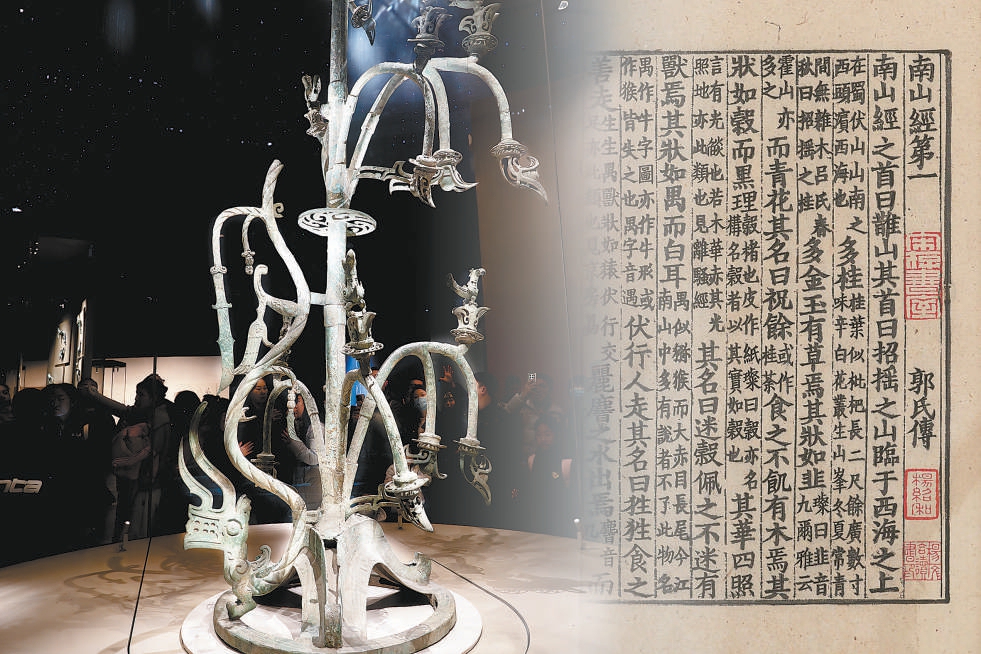 三星堆一号青铜神树 新华社发 《山海经》书影