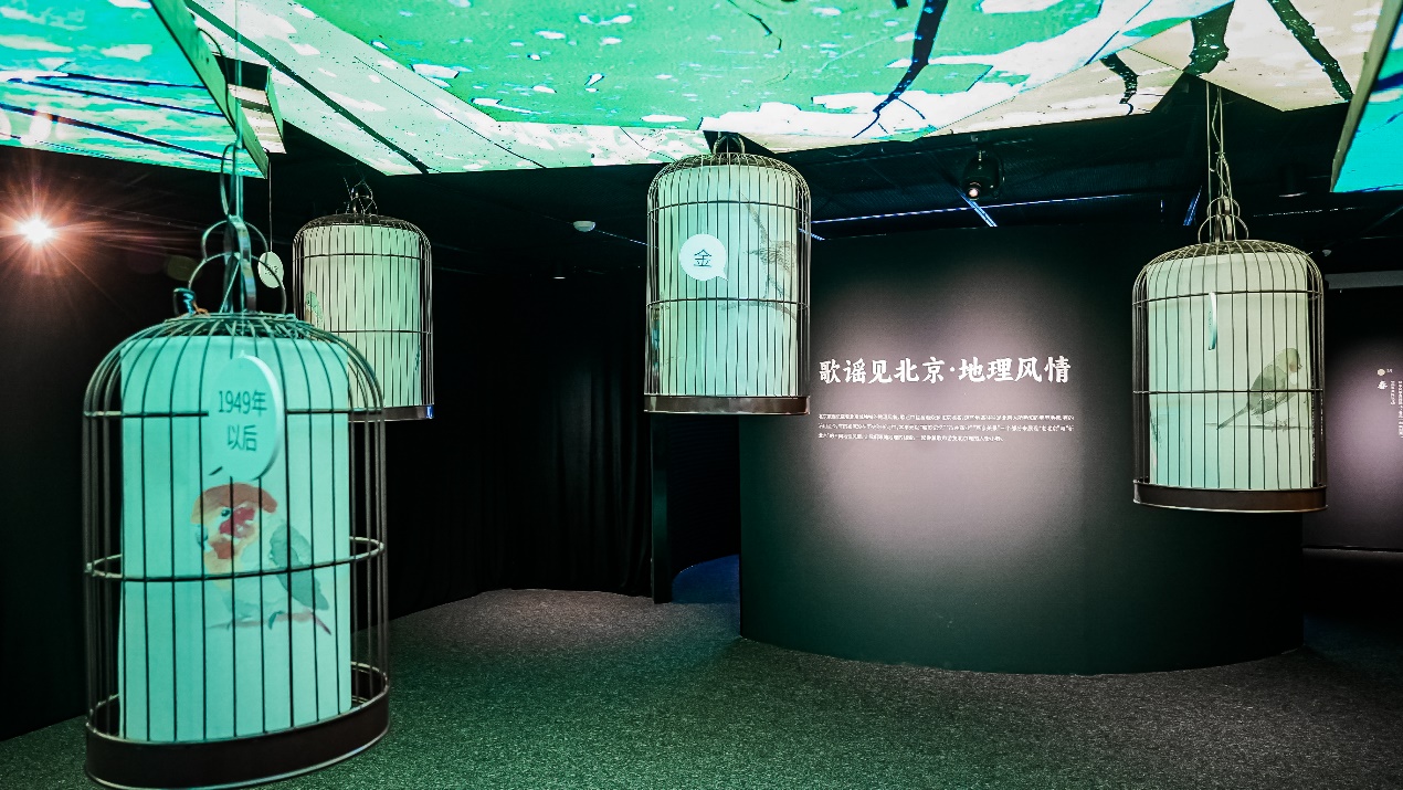 展览中一棵翠绿的“大树”,挂满了高低不同的鸟笼,读者不仅可在此享受夏天树下纳凉场景,感受年轮的流转,还可童趣般地将脑袋探入鸟笼聆听童瑶带来的别样欢乐。金代《泰和年间童谣》 、元朝《脚驴斑斑》、明朝《明正统京师童谣》等众多具有历史代表性的童谣,在鸟笼中欢唱着。用纱幕投影动态展示的北京街道影像,把胡同小吃和时令节气等人文主题童谣,融合在春、夏、秋、冬的季节光影里,让读者身临其境地感受着老北京歌谣的缤纷多彩与活泼可爱。《刘伯温造北京》《万寿山》《鲁班爷锯白塔》《前门楼子高不高》《前门情思大碗茶》等体现城市记忆、市井商业的歌谣,以及民间流传的歌谣、叫卖调、北京地区环境音、风声、雨声配合着图文互动大屏为读者精彩呈现。