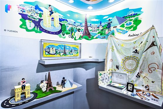 阅文还首次展出了一系列中法文化合作的IP衍生品。今年,阅文与法国埃菲尔基金会、中法品牌美学中心联合发起“阅赏巴黎”计划,邀请法国知名插画师安托万·卡比诺(Antoine Corbineau)操刀设计,将《庆余年》范闲、《全职高手》叶修、《诡秘之主》克莱恩·莫雷蒂等中国IP角色融入埃菲尔铁塔、凯旋门、卢浮宫等法国地标,形成东西方文化交融的独特艺术作品,并进行IP衍生开发。