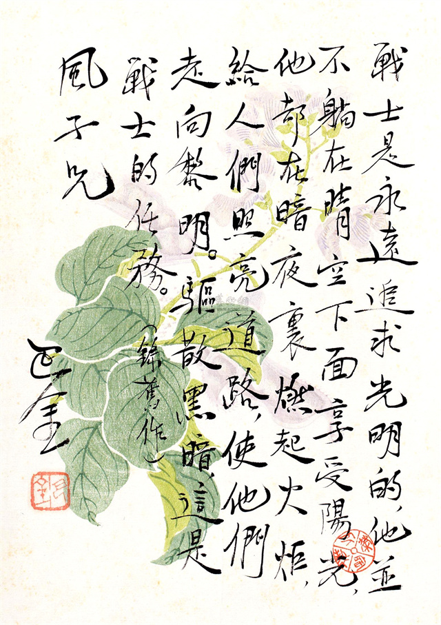 巴金手札,内容是“战士是永远追求光明的,他并不躺在晴空下面享受阳光,他却在暗夜里燃起火炬,给人们照亮道路,使他们走向黎明。驱散黑暗,这是战士的任务。”
