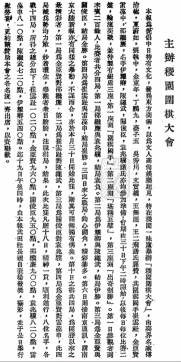 本报为提倡中日特有文化,发揭东方奕术,以为文人高尚娱乐起见,特在稷园一味庐举办“稷园围棋大会”,由奕界名家傅治芗、夏蔚如、张执中、金东年、丁国九、蔡子玉、吴秀川、文实权、王无厓、王二飞诸氏襄赞,其围棋国手崔云趾、金亚贤、雷葆中、邵继廉,名手伊耀卿、陈绳武、关俊臣、袁兆骥诸氏亦均参加准备,分期由三十日下午二时开始,以后每日每位比赛二盘,轮流奕战,并特制有银后三座,第一座刻“围棋国手”,第二座刻“堪称巨擘”,第三座刻“出奇制胜”。……迄十九日午后四时,由本报武田社长亲自莅场发奖、摄影,并于是日举行慰劳宴,更约请赞助本会之各名流一齐出席,以资联欢。(蔡天梅编著《新民报社史》,453页)