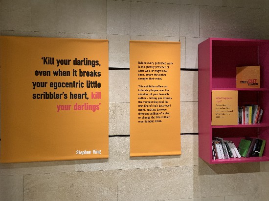 整个展览由牛津大学书志学和现代书籍史教授德克·范·赫尔(Dirk Van Hulle)与雷丁大学现代文学和贝克特研究教授马克·尼克松(Mark Nixon)策划,入口处的海报用大号字体印着斯蒂芬·金的一段写作箴言:“杀死你的宠儿,即使这会击碎你那颗三流作家的自尊心,杀死你的宠儿。”(Kill your darlings, even when it breaks your egocentric little scribbler’s heart, kill your darlings)右侧墙上挂着一个三层书柜,最上面是本次展览的图录,下两层则是展览中涉及的图书,以供参观者浏览对照手稿和出版成书之间的差别。展品覆盖的时段很长,从中世纪直到当下,可谓琳琅满目,包括十二世纪奥古斯丁会修士奥尔姆(Orm)的圣经评注《奥尔姆之镜》(Ormulum),作曲家巴赫在莱比锡时反复涂改的康塔塔乐谱,十八世纪英国小说家简·奥斯丁未完成的小说《沃森一家》(The Watsons)、1816年夏天诗人雪莱游览日内瓦湖时的绘画速写和风景描写(其中一段被他的妻子玛丽·雪莱借用到《弗兰肯斯坦》中),现代主义大家乔伊斯、艾略特和贝克特的手稿,1974年旅行作家布鲁斯·查特文(Bruce Chatwin)记录南美洲之旅的Moleskine笔记本(上面记录了他创作《巴塔哥尼亚高原上》的素材),一直到史上被选为牛津大学诗歌教授(Oxford Professor of Poetry,2019-2023)的首位女诗人爱丽丝·奥斯瓦尔德(Alice Oswald)画满抽象画的创作本。尽管我刻意加快速度,短短一个多小时还是不够用,后来又找时间去看了一次,才算是“走马观花”扫了一圈。虽然展出的不乏上面这些文学史上赫赫有名的人物,整个展览逛下来,我觉得最有意思的却是以侦探和间谍小说知名的两位“流行文学”作家:雷蒙德·钱德勒和约翰·勒卡雷。