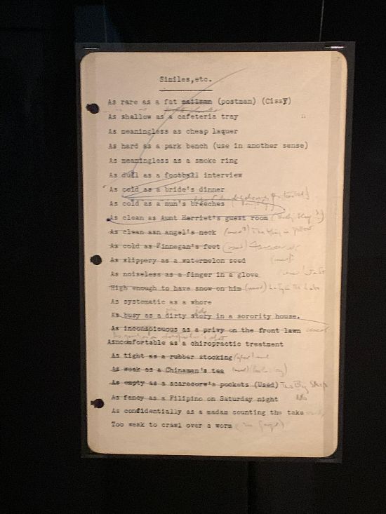 比喻是文学写作中常用的修辞手法,在英文里又细分为明喻(simile)和暗喻(metaphor)。精彩的比喻以新的角度揭示出两个不同事物的相似之处,让表达更加生动活泼。但很多比喻虽然最初令读者耳目一新,用得多了,用得久了,就失去了新鲜感,变得陈腐僵化,失去活力。例如提及爱情就说“爱情仿佛娇艳的玫瑰,需要悉心呵护,才能持久盛开”,写到夏天的太阳就必定是“炎炎夏日,骄阳似火”。既想利用比喻来吸引读者的眼球,又要避免老套的比喻败坏读者的胃口,这是每位写作者都会面对的两难。钱德勒的小说穿插着大量比喻,生动而不落俗套,他是如何做到的呢?展览上的三页清单透露了钱德勒的妙招。他将日常积累的比喻列出长长的清单,一旦用过某条,就用铅笔划掉,并在其后标注小说的名称,以免重复。我试着检索了其中几条被划掉的比喻,As empty as a scarecrow’s pockets (像稻草人的口袋一样空洞) 后面标着 Used, The Big Sleep,果然在《长眠不醒》(The Big Sleep)第二十五章找到;而另一条As slippery as a watermelon seed被写进了第二十六章,但出人意料地被用来形容声音:“The purring voice was now as false as an usherette’s eyelashes and as slippery as a watermelon seed .”(嗡嗡的声音现在像女领座员的睫毛一样假,像西瓜籽一样滑)。As cold as Finnegan’s feet被写进了《再见,宝贝》(Farewell, My Lovely)的句子中:“As cold as Finnegan's feet the day they buried him.”(就像芬尼根下葬那天的脚一样冰冷)一些没有用过的比喻也很精彩,例如As shallow as a cafeteria tray(像餐厅托盘一样浅薄),As meaningless as a smoke ring(仿佛烟圈一样毫无意义),No more personality than a paper cup(比纸杯还没有个性)。这几个例子中,钱德勒所用的喻体并不新奇,都很日常生活中随处可见的物品,但传达的感情十分符合他笔下硬汉侦探马洛冷酷而略带愤世嫉俗的视角。