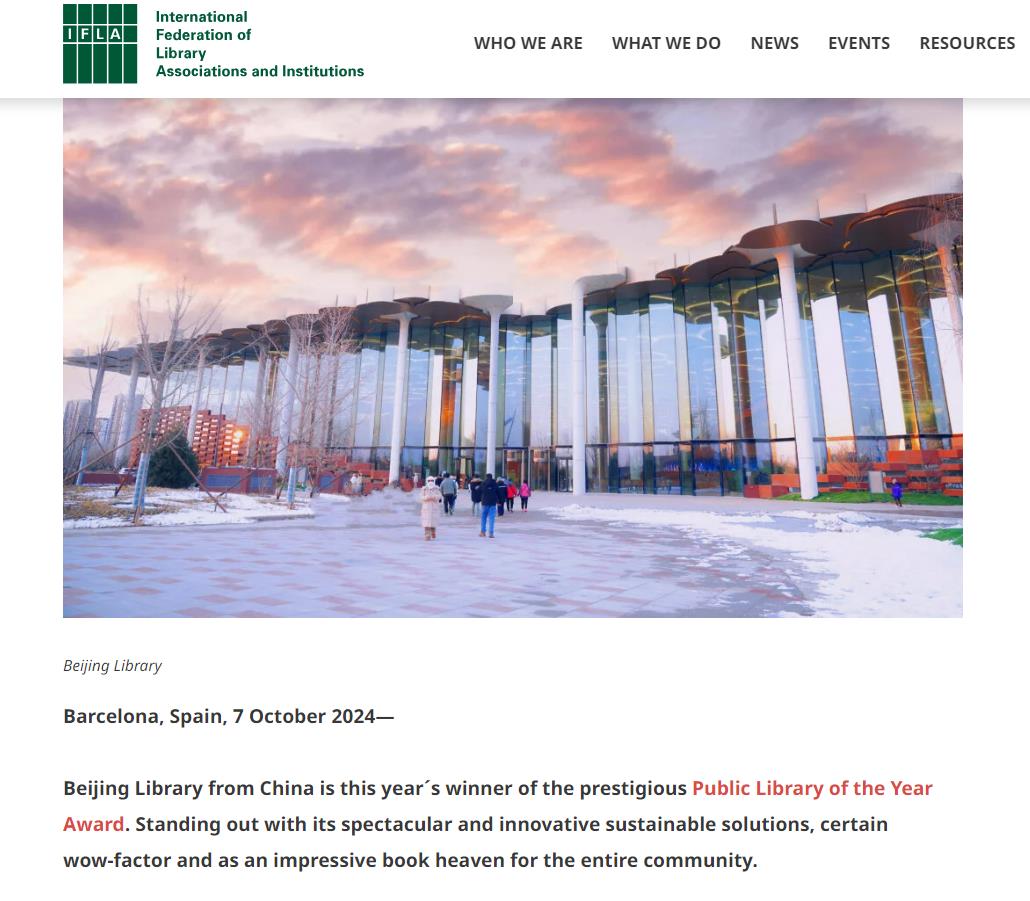 北京城市图书馆荣获国际图联(IFLA)2024年度公共图书馆奖