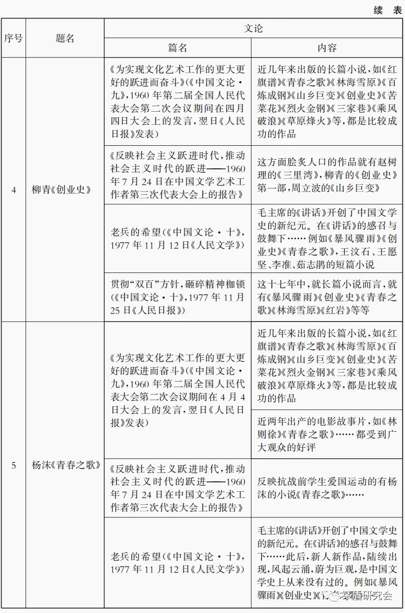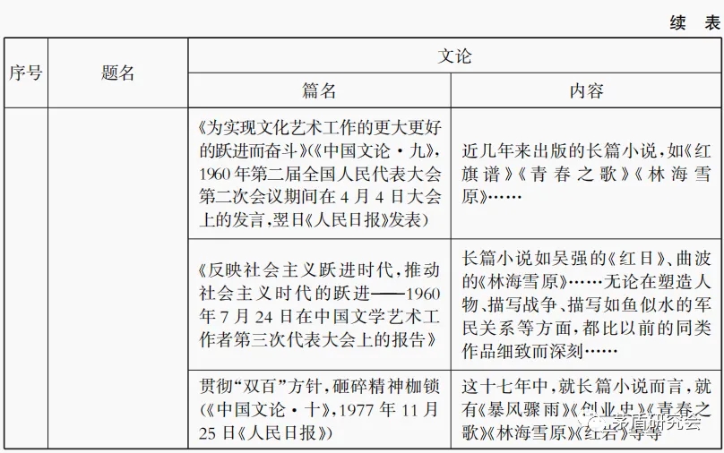 由表4可知,关于《红岩》的提及是最少的,梁斌《红旗谱》则较为频繁,在一次报告中三次提及,关于曲波《林海雪原》提及时间跨度最长,最早在1958的《谈青年业余创作——在沈阳市青年业余作者大会上的讲话》(《中国文论·八》,1958年《文学青年》第七期),最晚为1977年的《贯彻“双百”方针,砸碎精神枷锁》(《中国文论·十》,1977年11月25日《人民日报》)。