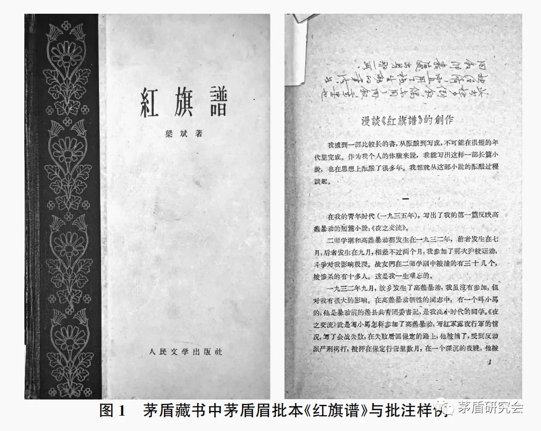 茅盾藏书中梁斌《红旗谱》中的批注为初稿,《茅盾全集》中读书笔记(1958年)根据茅盾未刊手稿情况刊发,此手稿内容与《红旗谱》书中批注内容构成茅盾对《红旗谱》评论观点的文本,此文本在当时并未公开发表,此文本中的观点在报告《反映社会主义跃进时代,推动社会主义时代的跃进——1960年7月24日在中国文学艺术工作者第三次代表大会上的报告》中单独成段关于《红旗谱》单独成段的评价观点基本一致,并在此报告与报告《为实现文化艺术工作的更大更好的跃进而奋斗》(《中国文论·九》,1960年第二届全国人民代表大会第二次会议期间在4月4日大会上的发言,翌日《人民日报》发表)中多次举例提及。