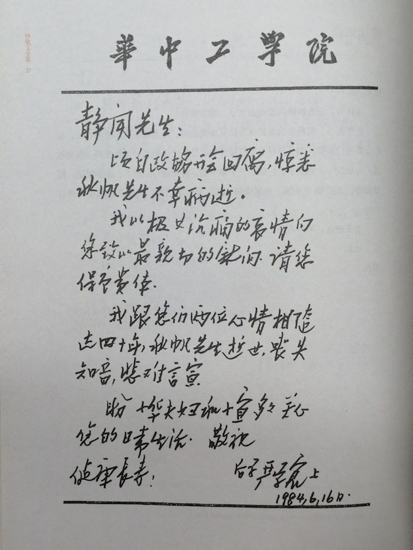 不过,或许因钟敬文先生太长寿且交游广泛,以致于他的学生们也弄不清楚严学宭究竟是谁。2018年出版的《钟敬文全集》第十四卷《学术书信卷》中,收录了严学宭致钟敬文两通信,只是释文中的严学宭都错成“严学宸”,末附《钟敬文往来书信主要学者简介》也不见“严学宭/严学宸”的踪影。抛开这些疏误来说,这两封信对揭示严学宭与钟敬文的交往颇有价值。其中一封唁函,是严学宭哀悼钟敬文夫人陈秋帆(1909-1984)逝世的,写于1984年6月16日,信中提及“我跟您们两位心情相随达四十年”,可见自1945年在中山大学相交以来,两家人数十年来交情不减。