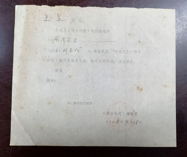 1986年,《语言研究》编辑部函请《中国语文》编辑王显先生审稿。原件藏湖南大学文学院资料室。