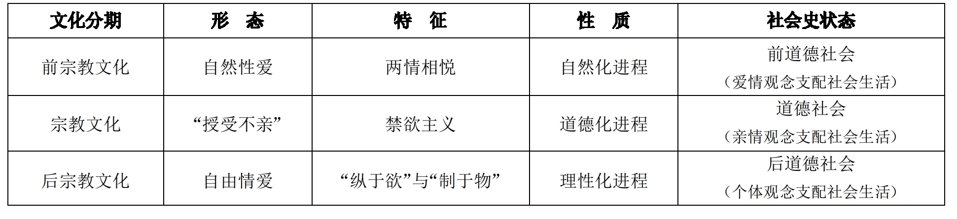 下表所列的是基于文化分期的情爱关系特征及其社会史状态: