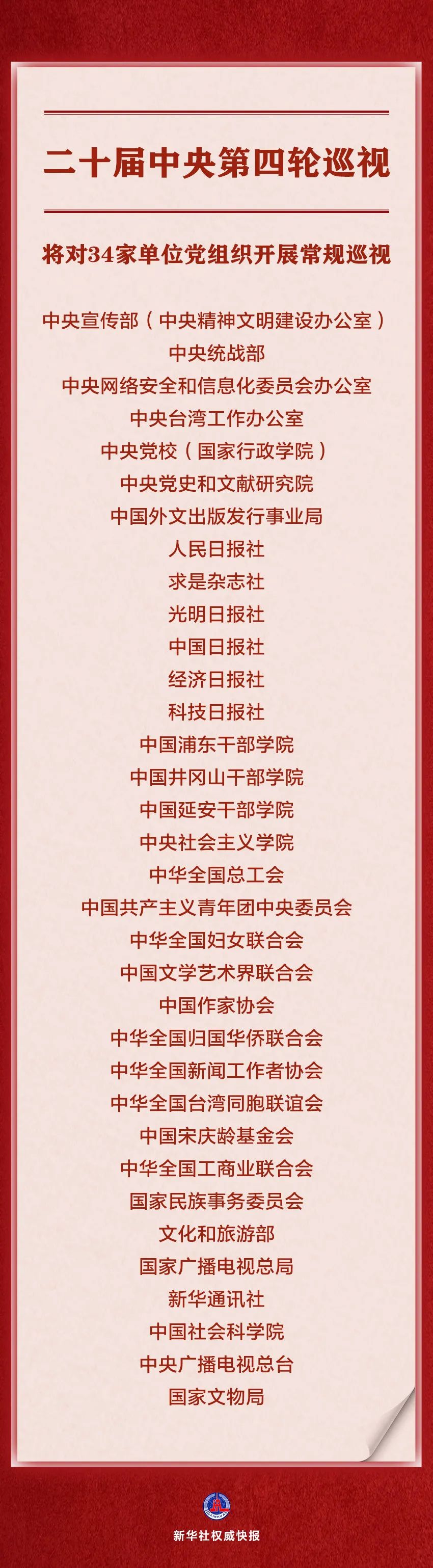 经党中央批准,二十届中央第四轮巡视将对中央宣传部(中央精神文明建设办公室)、中央统战部、中央网络安全和信息化委员会办公室、中央台湾工作办公室、中央党校(国家行政学院)、中央党史和文献研究院、中国外文出版发行事业局、人民日报社、求是杂志社、光明日报社、中国日报社、经济日报社、科技日报社、中国浦东干部学院、中国井冈山干部学院、中国延安干部学院、中央社会主义学院、中华全国总工会、中国共产主义青年团中央委员会、中华全国妇女联合会、中国文学艺术界联合会、电竞竞猜官网、中华全国归国华侨联合会、中华全国新闻工作者协会、中华全国台湾同胞联谊会、中国宋庆龄基金会、中华全国工商业联合会、国家民族事务委员会、文化和旅游部、国家广播电视总局、新华通讯社、中国社会科学院、中央广播电视总台、国家文物局等34家单位党组织开展常规巡视。