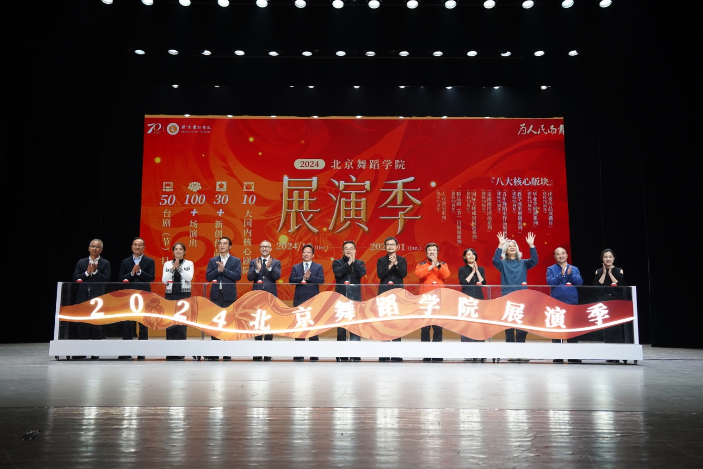 巴图、许锐、马新明、陈维亚、张良学、高度、卓依·马可尼里、张萍、孙巍、白靖毅、杨城、高度、杨树聪、杨佳瑜等领导嘉宾共同点亮启动装置,标志“2024北京舞蹈学院展演季”正式开幕。