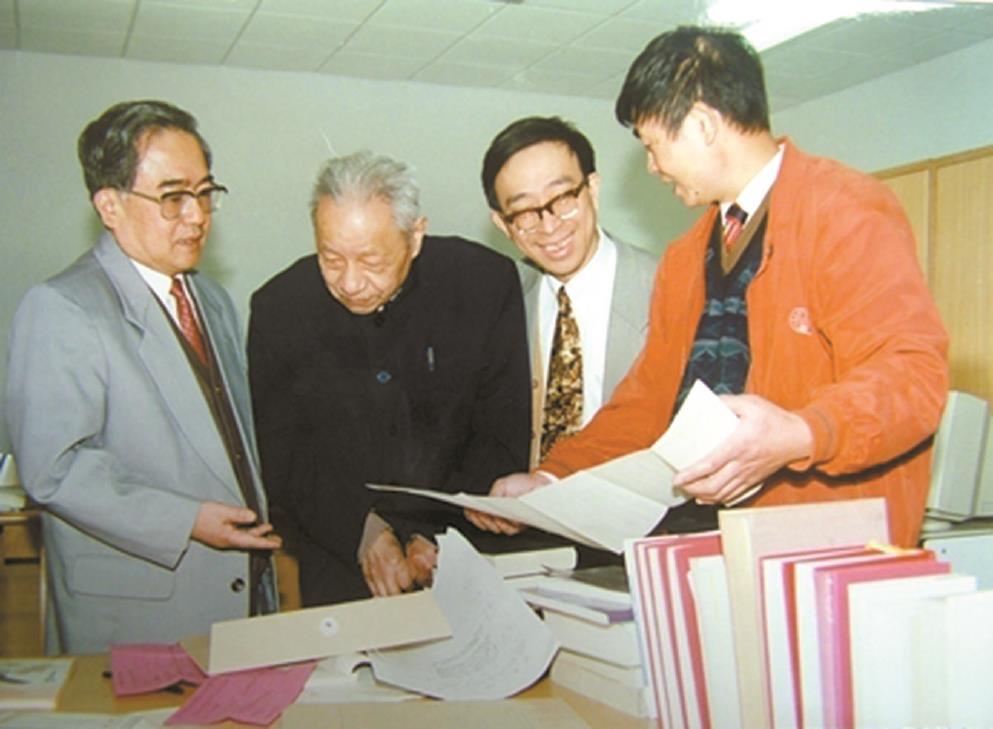 顾廷龙(左二)在指导“盛档”整理工作。右一为冯金牛,右二为陈燮君,左一为本文作者