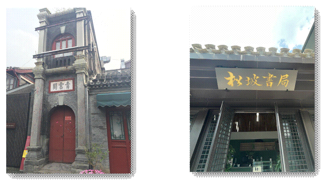 这张照片里的是青云阁,它在沈从文住过的杨梅竹斜街,当初是非常有名的商场。右边这张照片里的是松坡书局,在西单汉光百货背后。过去这里是民族大世界,是个小商品商场,就是卖箱包、皮带之类的。今年夏天我刚又专门去看了看,现在这儿被作为蒙藏学校旧址重新对外开放。但这个位置上实际上值得留存的不止蒙藏学校旧址,还有松坡书局,梁启超、徐志摩都和这里有关,所以能给松坡书局留个地方,这个保护我觉得还是很好的。